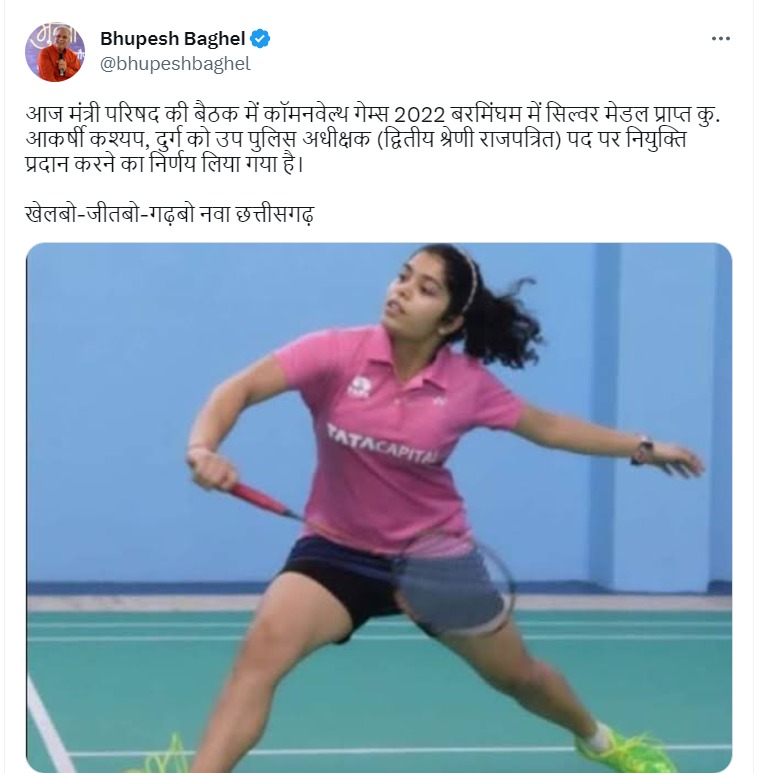 बता दें, भूपेश कैबिनेट मीटिंग में कॉमनवेल्थ गेम्स 2022 बरमिंघम में सिल्वर मेडल प्राप्त आकर्षी कश्यप, दुर्ग को उप पुलिस अधीक्षक (द्वितीय श्रेणी राजपत्रित) पद पर नियुक्ति प्रदान करने का निर्णय लिया गया. आकर्षी कश्यप छत्तीसगढ़ की दुर्ग जिला की रहने वाली है. आकर्षी का जन्म 24 अगस्त 2001 में भिलाई में हुआ. आकर्षी कश्यप एक भारतीय बैडमिंटन खिलाड़ी हैं, जिन्होंने नेपाल के काठमांडू और पोखरा में आयोजित दक्षिण एशियाई खेलों 2019 में स्वर्ण पदक जीता था. साल 2022 में आकर्षी ने व्यक्तिगत स्पर्धाओं में उबेर कप टीम, एशियाई खेलों और कॉमनवेल्थ गेम्स 2022 के लिए क्वालीफाई किया.